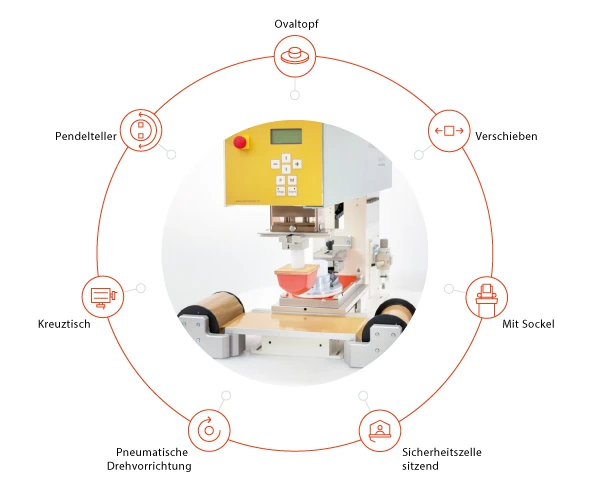 Für ein optimiertes Arbeiten empfehlen wir die Tamponreinigung. Ein Sockel mit höhenverstellbarem Tisch oder für Tischmaschinen, ein Kreuztisch runden den Arbeitsplatz ab. Bei Bedarf ist auch eine Ausrüstung mit Sicherheitszelle möglich. Dabei steht wahlweise eine Lichtschranke oder die 2-Hand-Bedienung zur Verfügung.