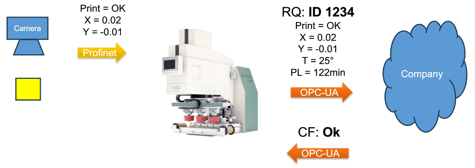 Before the part leaves the pad printing machine, it reports to the company software that the part has been printed, also providing additional data for analysis, such as pad printing parameters like pot life, temperature, humidity, or camera evaluation results.