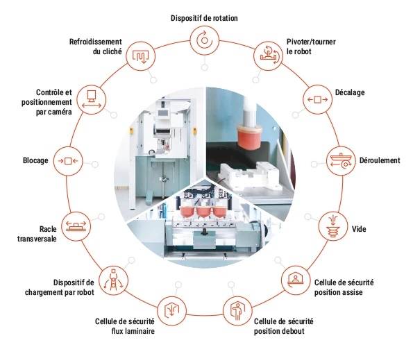 l’encrier de la couleur. Les cellules de sécurité peuvent être spécialement conçues pour les postes de travail en position debout ou assise. Elles peuvent également être équipées d’un plateau circulaire de commutation et d’un flux laminaire pour minimiser la production de poussière.