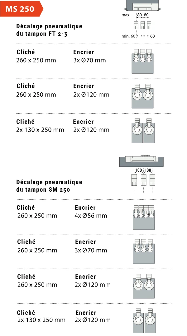 Le positionnement du tampon dans l’axe Y se fait par entraînement pneumatique et permet de régler mécaniquement en interne la position de prise d’encre et de transfert d’encre. Vous pouvez régler la position dans l’axe X et corriger l’angle à partir du support de cliché. Le décalage pneumatique du tampon 3 couleurs permet de toujours obtenir une image imprimée centrée, que cela soit avec 2 ou 3 couleurs. Le décalage électrique du tampon est capable de transférer jusqu’à 4 couleurs à différentes positions X. Au choix, vous pouvez travailler avec une combinaison de tampons ou un seul tampon.