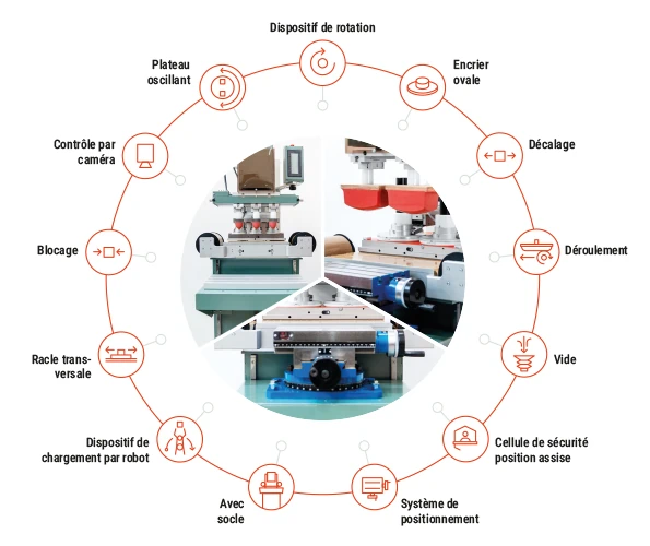 Afin d’assurer un fonctionnement autonome dans une installation, nous conseillons d’utiliser le système de surveillance du nettoyage des tampons ainsi que les Viscomat microPrint. La série MS peut aussi être équipée de 2 supports pour accélérer la production ou d’une table rotative pneumatique avec 6 supports pour une impression rapide en deux couleurs. Vous pouvez choisir d’équiper votre machine avec une table, avec un socle pour en faire un modèle statique, ou avec une cellule de sécurité. Le décalage des pièces permet d’intégrer dans le processus d’impression un pré-traitement ou un post-traitement, ainsi qu’un contrôle par caméra.